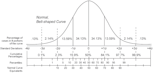 Percentile ranks are not on an equal-interval scale; that is, the difference between any two scores is not the same as between any other two scores whose difference in percentile ranks is the same. For example, 50 − 25 = 25 is not the same distance as 60 − 35 = 25 because of the bell-curve shape of the distribution. Some percentile ranks are closer to some than others. Percentile rank 30 is closer on the bell curve to 40 than it is to 20. If the distribution is normally distributed, the percentile rank can be inferred from the standard score.