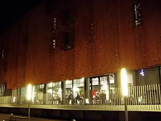 The building is kept in a simple architectural style with a corten-steel cladding and visible installations, commemorating the industrial heritage of the site.[1]