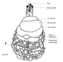 All species in the P. novaezealandiae-complex have fifteen pairs of unjointed, hollow cone-like limbs called lobopods.[6][2] This distinguishes them from the closely related P. suteri which has sixteen pairs of lobopods.[8][9] Peripatoides novaezealandiae-complex has three complete spinous pads and a fourth fragmented pad on the ventral side of the legs.[10] Individuals all have three distal papillae on the feet.[10][2]