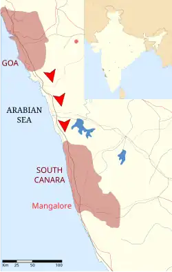 Roman Catholics from the South Canara district by the south-western coast of India, under the jurisdiction of the Mangalore Diocese, are generally known as Mangalorean Catholics.[11] They are Konkani people who speak the Konkani language.[12] All earlier records of South Canara's Christians were lost at the time of their deportation by Tipu in 1784 and it is not known when Christianity was introduced in South Canara. It is possible that Syrian Christians settled in South Canara as they had in Malabar, a region south of Canara.[13] During the 13th century Italian traveller Marco Polo recorded that there were considerable trading activities between the Red Sea and the Canara coast. Scholars have surmised that foreign Christian merchants were visiting the coastal towns of South Canara during that period for commerce, and that some Christian priests possibly accompanied them in their evangelical work.[14] In 1321, the French Dominican friar Jordan de Catalunya of south-western France, arrived in Bhatkal, North Canara.[15] According to historian Severine Silva, no concrete evidence has yet been found that there were any permanent settlements of Christians in South Canara before the 16th century.[14]