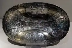 A number of Sasanid silver vessels have survived, especially rather large plates or bowls used to serve food. These have high-quality engraved or embossed decoration from a courtly repertoire of mounted kings or heroes, and scenes of hunting, combat and feasting, often partially gilded. Ewers, presumably for wine, may feature dancing girls in relief. These were exported to China, and also westwards.[44]