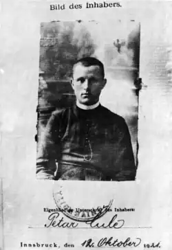 Šarić wanted to secure the state stipend for Čule.[19][20] Although his grades were satisfactory, Čule also needed confirmation on the property status of his parents.[20] However, the bishop of Mostar-Duvno Alojzije Mišić intended to appoint him a parish priest in Blagaj, from where he expelled a local Franciscan for disorderly conduct and couldn't replace him with another Franciscan due to the opposition from the locals. The Provincial of the Herzegovinian Franciscans asked Mišić to find a diocesan priest.[19][21] Čule was supposed to take the post on 8 September 1921—this endangered Čule's intention to continue his education.[22] However, the Provincial changed his mind and proposed Mišić yet another Franciscan for the duty.[19] Mišić agreed to drop the appointment but still insisted on keeping Čule as a parish priest or a chaplain. Nevertheless, Čule asked the bishop to send him for further education.[19][21] The time for the stipend already expired.[21] However, the rector of the Catholic Faculty of Theology in Sarajevo Antun Prešern managed to arrange a place for Čule at the Jesuit Collegium Canisianum in Innsbruck, Austria.[19][21] As he didn't manage to secure the stipend, Čule managed his financing by himself.[19] At the end of September 1921, Čule was in Innsbruck. The study system was the same as in Sarajevo, which suited Čule.[21] On 12 July 1912, Čule defended his doctoral thesis titled De statu hominis of St. Bonaventure and was given the title of doctor of theology. He finished his studied in Innsbruck with summa cum laude.[19][21]