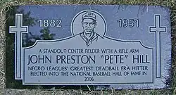 Hill was inducted into the Baseball Hall of Fame in 2006 along with 16 other Negro league and pre-Negro league figures.[12] In late July 2010, the Hall of Fame announced that it would commission a new plaque to correct Hill's name from Joseph Preston Hill to John Preston Hill. The new plaque was unveiled at a ceremony on October 12, 2010, attended by Hill's relatives and researchers.[13] Although he died in Buffalo, NY, he is buried in Holy Sepulchre Cemetery in Alsip, Illinois.[14] His grave, originally unmarked, has a marker provided by SABR.