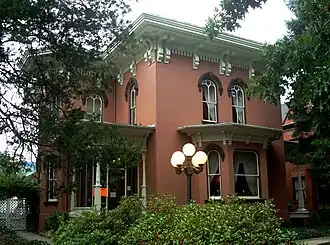 The Peter Herdic House is a 2+1⁄2-story, brick building that was coated in stucco. Designed in the Italian Villa style, it features three bay windows on each floor and a distinctive cupola atop the roof.[7]