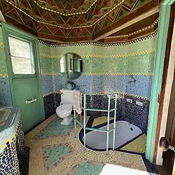 Built between 1933 and 1938, the house features an abundance of recycled and reclaimed materials and finishes, ornate hand-carved details, and colorful decorated ceilings. Some ahead-of-their-time systems include a 1935 roof-mounted solar water heater enclosed by repurposed Model T windshields and seismic fittings in the basement to protect against earthquake damage, informed by Weber's early work as a teenager with architects including John Galen Howard and Julia Morgan following the 1906 San Francisco earthquake and fire.[4] While Weber was trained and highly skilled in the Beaux Arts style of architecture, for his personal home much of the design was inspired by what he had seen on his year-long honeymoon travels in Europe and North Africa from 1931 to 1932, in particular Mediterranean Moorish and Spanish architecture. The house was initially designed to be expanded into a three-bedroom home with a lookout tower and adjacent den, but Weber never finished the intended expansion due to increased development in the area and other practical restrictions. Rooms include a three-bay garage with basement, wash house, kitchen, breakfast room, and living room with one bedroom and one bathroom. The house was surrounded by ten acres of citrus, stone fruit, and nut trees and bordered a branch of the Gage Canal at its south end. When mother-in-law Amelia Hartnett came to live with them in 1941 after the death of her husband, the Webers relocated their sleeping quarters to the rooftop deck with a corrugated metal shade for protection and slept there year-round. It remained the family home for Weber, his wife Clara, son Peter N., and Amelia Hartnett for almost 40 years.