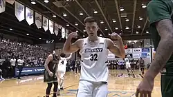 In Kiss' first year at Bryant, he played in and started in 22 games averaging 16.6 points per game. As a result, Kiss was named to the First-team All-NEC.[8] In Kiss' second season with Bryant, he led the NCAA in scoring.[9] Kiss averaged 25.1 points per game. Kiss became the fastest player in program history to tally 1,000 points, doing so in 48 games.[10] During the season, Kiss was suspended for the first two games by Bryant head coach Jared Grasso for an unspecified violation of team rules.[11][12] Kiss was suspended for a second time for unsportsmanlike conduct in a game against Long Island. The suspension kept Kiss out for another two games.[13] Throughout the season, Kiss led the NCAA in technical fouls with 9.