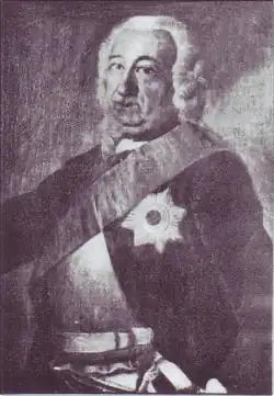 Shortly before the beginning of the War of Austrian Succession (1740–1748), the new king, Frederick, sent Moulin to Vienna explore the situation with Austria. Consequently, he was not with the troops at the outbreak of war, but returned to the Prussian army to take part in the Battle of Mollwitz on 10 April 1741. He was promoted to major general on 5 June, and on 25 June he became the proprietor of the Infantry Regiment Nr. 37, garrisoned in Breslau.[2] The previous proprietor was Paul Heinrich Tilio de Camas.[3] In 1742, Moulin covered the rear of the army during the Battle of Chotusitz and then became commander-in-chief of the fortress at Glogau. In gratitude for his services, he received the municipal office of Raden at Rinteln, in addition to that of Kolbatz, which he had held since 1731.[2]