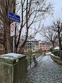 Downstream of the Ponts Couverts, the four channels flow through an area of largely half-timbered buildings which, together with the narrow lanes and footbridges that connect them, mostly date from the 16th and 17th centuries. The sloping roofs of many of the buildings include open lofts where hides were once dried. Three of the four channels flowing through the quarter run over weirs that once drove mills and other industries, whilst the northernmost channel is navigable. This passes through a lock and the Pont du Faisan swing bridge in the centre of the quarter, and is largely used by passenger trip boats.[1][6][7]
