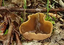 Peziza arvernensis, commonly known as the boring brown cup fungus or fairy tub,[2] is a species of apothecial fungus belonging to the family Pezizaceae. The ascocarps appear as cups, growing up to 8 cm (3+18 in) across.[2] Their exterior is pale tan and the interior is brown.[1] Peziza vesiculosa and P. violacea are similar, young specimens of the latter having a violet hue.[1]