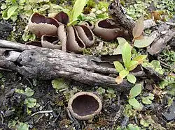 Peziza praetervisa, commonly known as the purple fairy cup or the fireplace cup,[2] is a species of fungus in the genus Peziza, family Pezizaceae. Recognized by its flattened, purple, cup-like fruitbodies, this widespread fungus typically grows scattered or in clusters on burnt ground.