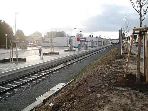 The station was opened with the Pfungstadt Railway by the Grand Duchy of Hesse State Railways in 1886. This was taken by Grand Duke Louis IV of Hesse-Darmstadt as an opportunity to give Pfungstadt town privileges. The original station building has been demolished. A new, simply-equipped station with a 140 metre-long platform was built on the foundations of the historic station for the reactivation.[4] Access for local traffic is provided by a terminal loop and a park and ride parking area. Of the total costs of €2.8 million, the state of Hesse assumed €170,000 and the rest was shared by the town and the federal government.[4]