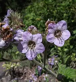 It bears attractive papery inch-wide purple, lavender, or blue flowers and strongly toothed leaves which resemble those of grape. The plant blooms later than most others, and is commonly in flower during the hottest summer months.
