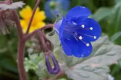 The hairy, glandular inflorescence is a one-sided curving or coiling cyme of bell-shaped flowers. Each flower is 1 to 2 centimeters long and brilliant deep blue in color with usually five small white spots above the white tubular throat. It has five protruding stamens tipped with white anthers.