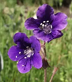 The inflorescence is a cyme of widely bell-shaped flowers each 1 to 2 centimeters long. The flower is purple in color, sometimes with pale coloration in the throat, and an arrangement of five white spots. The five protruding stamens are hairy and tipped with white anthers.