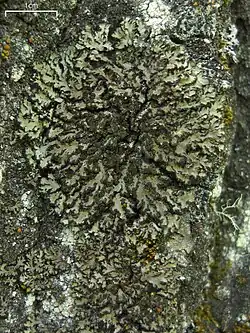 Phaeophyscia sciastra, commonly known as the dark shadow lichen or the five o'clock shadow,[2] is a widespread species of foliose lichen in the family Physciaceae.[3] This rock-dwelling species tend to form rosettes on sun-exposed rocks, especially sandstone. The thalli, which grow up to 5 cm (2.0 in) in diameter and are closely attached to their substrate, are made of flat to convex lobes typically up to 0.5 mm wide.[4] The lichen occurs in Africa, Asia, Europe, and North America, and is one of the most widespread members of its genus in boreal and subtropical regions.