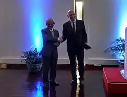 Historian Phan Huy Le (left) receive a medal from Professor Michel Zink at the French Embassy in Vietnam, 2017