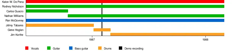 In 1986, De Pena convinced McGovney to return to music after the four-year hiatus that followed McGovney's departure from Metallica.[1] They formed Phantasm with young guitarist Rodney Nicholson and Hirax members Carlos Guacio playing guitar and Johny Tabares playing drums. Nathan Williams replaced Guacio later that year. Hoglan, then of Dark Angel, played drums on the 1987 Wreckage demo cassette, the group's only studio recording. Teenage drummer Jim Korthe joined the group thereafter.