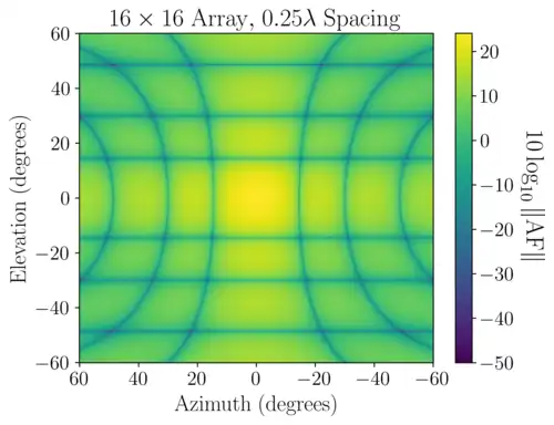 The total directivity of a phased array will be a result of the gain of the individual array elements, and the directivity due their positioning in an array. This latter component is closely tied (but not equal to[27]) to the array factor.[28][27] In a (rectangular) planar phased array, of dimensions , with inter-element spacing and , respectively, the array factor can be calculated accordingly[2][28]: