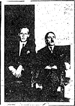 Achromatic, slightly torn photo print of two suited men indoors: to the left sits a balding blond eying the camera and to the right, a sunken-jowled Hitler.