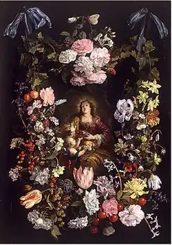He also created garland paintings. Garland paintings are a special type of still life developed in Antwerp by artists such as Jan Brueghel the Elder, Hendrick van Balen, Frans Francken the Younger, Peter Paul Rubens and Daniel Seghers. They typically show a flower garland around a devotional image or portrait. Garland paintings were usually collaborations between a still life and a figure painter.[4][5] De Marlier and his studio often produced garland paintings in collaboration with other painters, such as Frans Francken the Younger, who painted the figures while de Marlier painted the garland.[2]