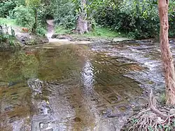 The Kbal Spean archaeological site, also known as "Valley of a thousand Lingas" (Khmer: លិង្គ១០០០), is located on the mountain, along the Kbal Spean River, which is a tributary of Siem Reap River. The site has many figures of Yoni and Linga as well as other figures carved into the rocks of the riverbed and banks which may become fully exposed in the dry season when the river dries up. The river is shallow and small waterfalls form at the site in the wet season. The site is accessible by trekking uphill through a 1.5 kilometres (0.93 mi) jungle track from the parking site.