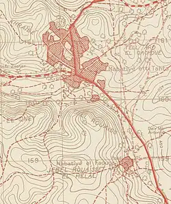The Ruweiseh arrowhead was the first discovered in modern times, and still the only one found in archaeological context. It was found at Roueisseh, near Nabatieh Fawka ("Upper Nabatieh), by Pierre Giugues during an archaeological survey of necropolises in the area.[10] Two arrowheads were discovered in the same tomb, but the second had no inscription. The tomb had been reused into the Hellenistic period, such that the contents of the tombs were overturned, making any stratigraphic study impossible.[11][10]