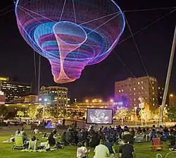 The land the park is located on was a combination of old buildings and parking lots before the City of Phoenix began buying the properties. The main building renovated in the project is called the A.E. England Building. Originally opened in the 1920s as a car dealership, it now houses retail space and a community meeting room for special events. In the outdoor spaces, the majority of the park (over 70%) will be shaded, once all the trees have fully matured, through a combination of trees and shade structures. Solar panels covering the tops of the shade canopies produce a combined 75 kilowatts of power. The centerpiece of the park is the US$2.4 million sculpture by Janet Echelman called Her Secret Is Patience.[1] It consists of multicolored fiber nets suspended up to 145 feet (44 m) in the air. At night ground-mounted colored lighting changes throughout the season and gives a different appearance to the daytime look.[2] It was questionable whether or not the piece would be built as the leaders at the City of Phoenix changed their minds several times whether or not to build the art piece.[3] In 2011 the park won the Rudy Bruner Award for Urban Excellence silver medal.[4]