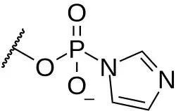 A phosphorimidazolide is a chemical compound in which a phosphoryl mono-ester is covalently bound to a nitrogen atom in an imidazole ring. They are a type of phosphoramidate. These phosphorus (V) compounds are encountered as reagents used for making new phosphoanhydride bonds with phosphate mono-esters, and as reactive intermediates in phosphoryl transfer reactions in some enzyme-catalyzed transformations. They are also being studied as critical chemical intermediates for the polymerization of nucleotides in pre-biotic settings.[1] They are sometimes referred to as phosphorimidazolidates, imidazole-activated phosphoryl groups, and P-imidazolides.