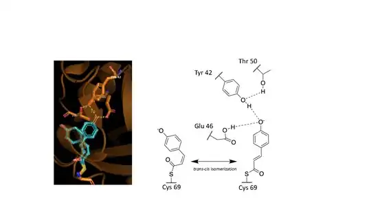 Hydrogen bonds in proteins such as PYP take part in interrelated networks, where at the center of p-coumaric acid's phenolate O4 atom, there is an oxyanion hole that is crucial for photosensory function.[6][11][12] Oxyanion holes exist in enzymes to stabilize transitions states of reaction intermediates, thus stabilizing the transcis isomerization of p-coumaric acid.[5][13] During the transition state it is believed that the p-coumaric acid phenolate O4 takes part in a hydrogen bond network between Glu46, Tyr42 and Thr50 of PYP.[13][5] These interactions are apart from the thiol ester linkage to Cys 69 keeping p-coumaric acid in the ligand binding site.[3] Upon transitioning to the cis-isomeric form of p-coumaric acid the favorable hydrogen bonds are no longer in close interaction.