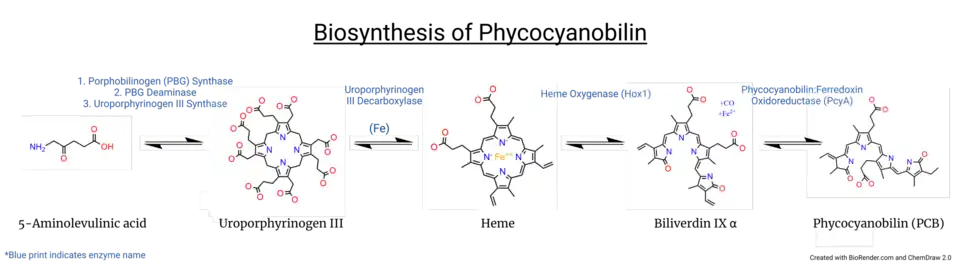 The biosynthetic pathway of phycocyanobilin begins with 5-Aminolevulinic acid (5-ALA).[2] Two molecules of 5-ALA undergo a condensation reaction catalyzed by Porphobilinogen (PBG) Synthase to yield a molecule of Porphobilinogen (PBG) (not shown).[3] Four molecules of PBG are polymerized into a linear tetrapyrrole by Porphobilinogen deaminase. This reaction releases four ammonia molecules in the process. Completion of the tetrapyrrole is performed by Uroporphyrinogen III synthase which results in the macrocyclic Uroporphyrinogen III. Uroporphyrinogen III is then converted to a Heme by a Uroporphyrinogen III decarboxylase. The heme molecule is converted to Biliverdin IX α. Biliverdin is then finally reduced to Phycocyanobilin (PCB) by the Phycocyanin Ferredoxin Oxidoreductase PcyA. Literature circa 1989 includes phytochromobilin as an intermediate in this final conversion.[2]