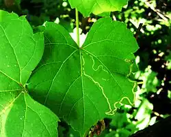 | Leafmine in frost grape (Vitis vulpina) caused by Phyllocnistis vitifoliella | |