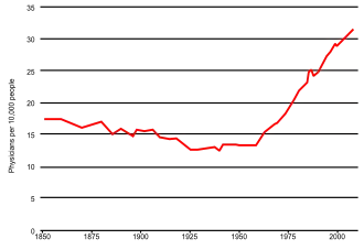 While an impending "doctor shortage" has been reported, from 2010 to 2018, the actively licensed U.S. physician-to-population ratio increased from 277 to 301 physicians per 100,000 people. Additionally, the number of female physicians, and osteopathic and Caribbean graduates have increased at a greater percentage. [13] [14]