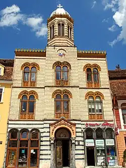 The style is neo-Byzantine, with a central dome and bell tower. It measures 26.6 by 12.3 meters. A spire facing Piața Sfatului was added later. This collapsed during the 1940 Vrancea earthquake and was rebuilt in 1973. The iconostasis is carved and gilt, and was painted in 1898. The interior painting, dating to 1937, was restored in 1965–1966, 1985 and 2005.[1]
