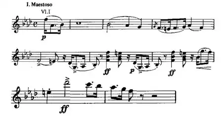 A work of "undescribable beauty",[5] this nocturnal movement is said to have been inspired by Chopin's distant idolization of Konstancja Gładkowska or of Tytus Woyciechowski.[6][7] The main theme (the "A" section) is introduced by the piano after an orchestral introduction and is later repeated twice and again, at measure 82 (the start of the coda), is enhanced by the sublime entrance of the bassoon in canon, followed by the bassoon transitioning to a counter-melody.
