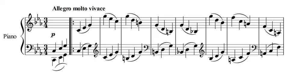 The second movement is a scherzo and is in ternary form (the norm for scherzi). Beethoven specifically notates the first phrase to start in the second bar.[12] The main theme consists of mostly quarter notes in parallel octaves. Inside the theme, the first 16 bars are repeated outside an 8-bar middle strain.[12] When it returns following the trio section, the left hand plays staccato and the notes of the right hand part (still legato) are offset half a beat later.[12] The movement includes a brief coda and concludes on the chord C major, a Picardy third.