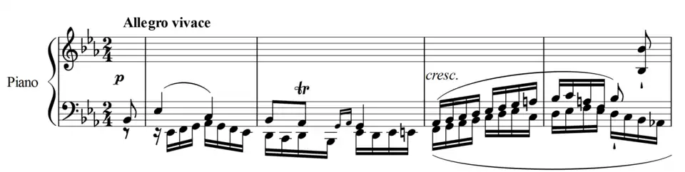 The finale is the most extended movement of the work. Charles Rosen notes, "With this movement, Beethoven began an experiment, to which he continued to return and develop through the years, of displacing some of the weight of the work from the opening movement to the finale".[4][14] The work is in fast tempo and in sonata rondo form.[15] After the second B section, the main theme of the slow movement briefly returns, followed by a brief cadenza.[12] There follows the final A section, marked Presto.[4]