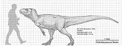 The holotype specimen of Piatnitzkysaurus, PVL 4073, was collected during expeditions in 1977, 1982, and 1983 at the Cañadón Asfalto Formation in sediments that were deposited during the Middle-Late Toarcian stage of the Jurassic period, approximately 179 to 177 million years ago.[1][2] The specimen was very complete and is one of the best known from a megalosaur, including a partial skull and partial anterior postcranial skeleton of a subadult individual preserved in semi-articulation.[3] Later in 1986, several bones of an adult individual were referred to the taxon and are the only described material besides the type.[3]