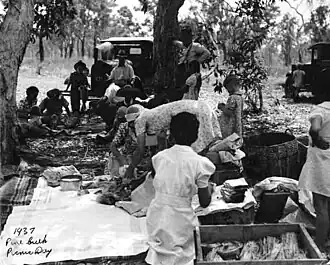A regular annual Union Picnic Day or Trade Picnic Day was observed at Adelaide River[3] by railway employees working on the North Australia Railway.[4] The date of the first event is not known. The event included Public Works employees on some occasions.[5][a] Between 1926 and 1935 a railway Picnic Day event was not held. An attempt was made to revive the holiday in 1933,[6] but it was not officially observed again until three years later.[7] On Monday 5 October 1936, a train transported people from Darwin to Adelaide River, leaving at 7 am and returning at 11 pm. The hotel at Adelaide River recorded record sales and the train was "forced to stop often as a number of male Darwin passengers fell off at various points along the line".[8]