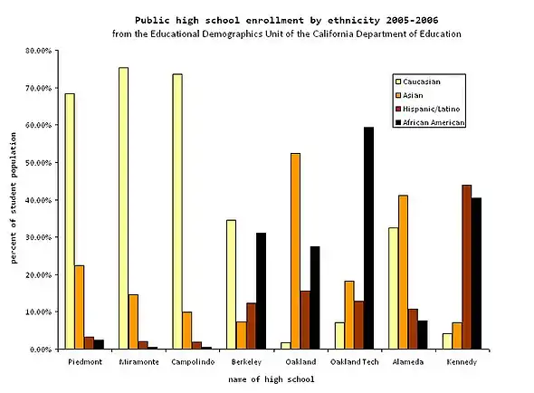 The majority of the student body is white, 68%, and Asian, 22%.[18] In 2004, the San Francisco Chronicle highlighted the lack of racial and socioeconomic diversity in Piedmont in a Sunday front-page story. Comparing schools in Oakland and Piedmont, the article writer wrote that "wealth has created separate and unequal schools in [the] Bay Area and elsewhere."[19]