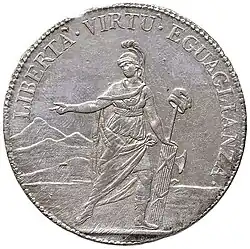 The republic used the motto Libertà, Virtù, Eguaglianza, echoing the French motto Liberté, égalité, fraternité, on its coins.[3]
