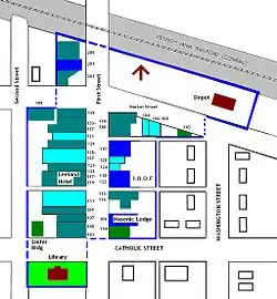 • 110- Flat Iron Hotel; Italianate, c.1880 (C) Across from the Depot is the former Flat Iron Hotel. Contemporary to the Depot, it is the oldest surviving commercial building in the district. Three large, round-arched openings remain on the first floor main or north facade and are reminiscent of the days when the building housed the town's post office, an office, and other commercial uses. The main facade is enhanced by ornate brickwork on the cornice. Detailed brick pavers form the sidewalk in front of the building.[2]