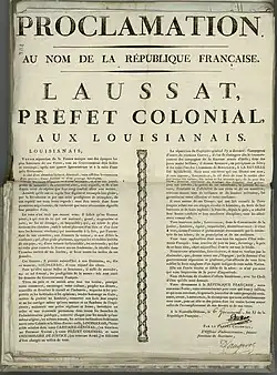 6. ^ de Laussat, Pierre-Clément. "Proclamation. Au Nom de la République Française." (1803-03-27) [document]. France aux Amériques, File: FR ANOM C 13A 52 Fo 304. Paris, France: Archives nationales d'outre-mer, Bibliothèque nationale de France: Gallica.
