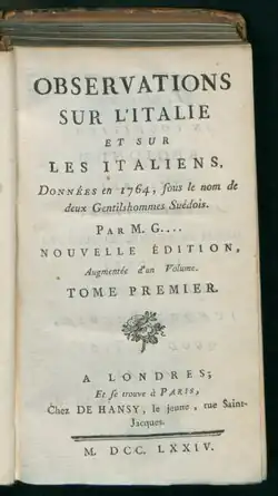 - Nouveaux Mémoires ou observations sur l'Italie et sur les Italiens, par deux gentilshommes suédois, Londres, 1764, 3 vol. in-12; 1770, 5 vol. in-12 ; Londres, Lausanne, 1770, 3 vol. in-12; 1774, 4 vol. in-12 ;