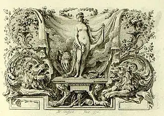 To these succeeded, among a host of minor pieces, the large ornaments placed at the head of each book of the Ovid's 'Metamorphoses' of 1767–1771, the headpieces to Saint-Lambert' s poem, 'Les Saisons,' issued in 1769, and again with some alterations in 1775, those to Imbert's poem, 'Le Jugement de Paris,' 1772, and the tail-pieces to Desormeaux's 'Histoire de la Maison de Bourbon,' published in the years 1779–1788. All these combined to establish his reputation as a designer of ornament without a rival. Besides these, the ornamental pieces which he executed for the 'Voyage pittoresque de Naples et de Sicile' of Saint-Non, published in 1781, and the plates of 'Les Amants surpris,' 'Les Amours champêtres,' and 'Marchez tout doux, parlez tout bas,' after Baudouin, and a view of Narbonne, after Monnet, must be ranked among his best works.