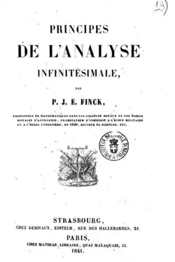Finck wrote seven text books on algebra, geometry, mechanics and calculus, and more than twenty articles published in the Journal de Mathematiques Pures et Appliquees, in the Annales de Gergone and in the Comptes rendus of the French Academy of Sciences.[4]