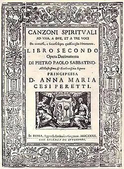 - ^ Comune di Ronciglione: Fabio Carboni, Valeria De Lucca, Agostino Ziino - 2003 "Sabbatini lavorò presso questa Arciconfraternita certamente fino al 1628, come risulta dal frontespizio del Sesto Libro di ... di Pietro Paolo Sabbatini Maestro di Cappella dell' Arciconfraternita della Morte, & Orazione di Roma."