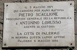 On May 5, 1971, Scaglione was killed with his driver Antonino Lo Russo, when he returned from his daily visit to the tomb of his wife at the Cappuccini cemetery in Palermo. It was the first time since the end of World War II that the Mafia had murdered an Italian magistrate. The police rounded up 114 Mafiosi who would be tried in the second Trial of the 114.[2][3]