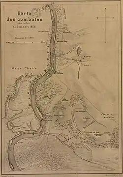 The geography was very unfavorable to the attackers, muddy, wet and constantly rainy, with abundant insects. On the 23rd of September, they reached a stream, Surubí-i, that was defended by Paraguayan troops under Colonel Julián Roa.[22] The Brazilians managed to dislodge them; by the next day, they had taken the minor port of Palmas.[23] From it, Caxias was able to see the Paraguayan fortifications; Angostura blocked the Paraguay River further upstream, and they were nigh impervious to frontal assaults due to the lines being built against the Pikysyry, which had been dammed by the Paraguayans and was unfordable.[24]