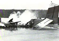 At approximately 1533, unable to reach T. F. Green Airport in time, Captain Prinster made a forced landing on the foot-thick ice of the western arm of Scituate Reservoir, 12.5 miles (10.9 nmi; 20.1 km) west-northwest of the airport, with the right wing and left main landing gear breaking off upon impact.[1][7][9] The flight crew and nine of the ten passengers managed to evacuate the burning aircraft and walk to shore (the tenth, a 59-year-old woman with severe chronic obstructive pulmonary disease and marked atherosclerosis, was overcome by smoke and toxic gas before she could escape). Of the eleven survivors, all but one sustained serious injuries in the accident; most of the passengers received blunt-force injuries of varying severity in the hard landing, the flight crew and two passengers were burned by the inflight fire (Captain Prinster received second-to-third-degree burns over 50 to 70 percent of his body surface and spent months in hospital, but ultimately survived;[9][4] First Officer Hogg, although also suffering second-to-third-degree burns, was burned less extensively, due both to his wearing thicker clothing and to the fire being concentrated on the left side of the aircraft; and the two burned passengers sustained first-and-second-degree burns to their hands and arms), and all of the survivors suffered from smoke inhalation.[1][2][3][7][8][10] The aircraft's fuselage was almost completely destroyed by fire after the landing, with the only surviving parts of the passenger cabin being the stainless-steel seat frames[e] and melted lower-fuselage structure.[1][5]