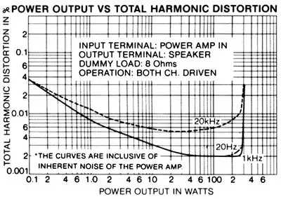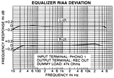 Apart from its high output power capability, the Pioneer SX-1980 had quite advanced performance in many other important areas. The THD versus frequency response curve showed very low distortion levels over a wide range of operating conditions. Phono cartridge load selectors allowed the user to select from three input resistances (10, 50, and 100 kΩ) and four input capacitances (100, 200, 300, and 400 pF). The RIAA equalisation was accurate to within ±0.2 dB from 20 Hz to 20 kHz (tested as ±0.1 dB[4]), and a high-accuracy performance specification such as this is not often achieved, even today.